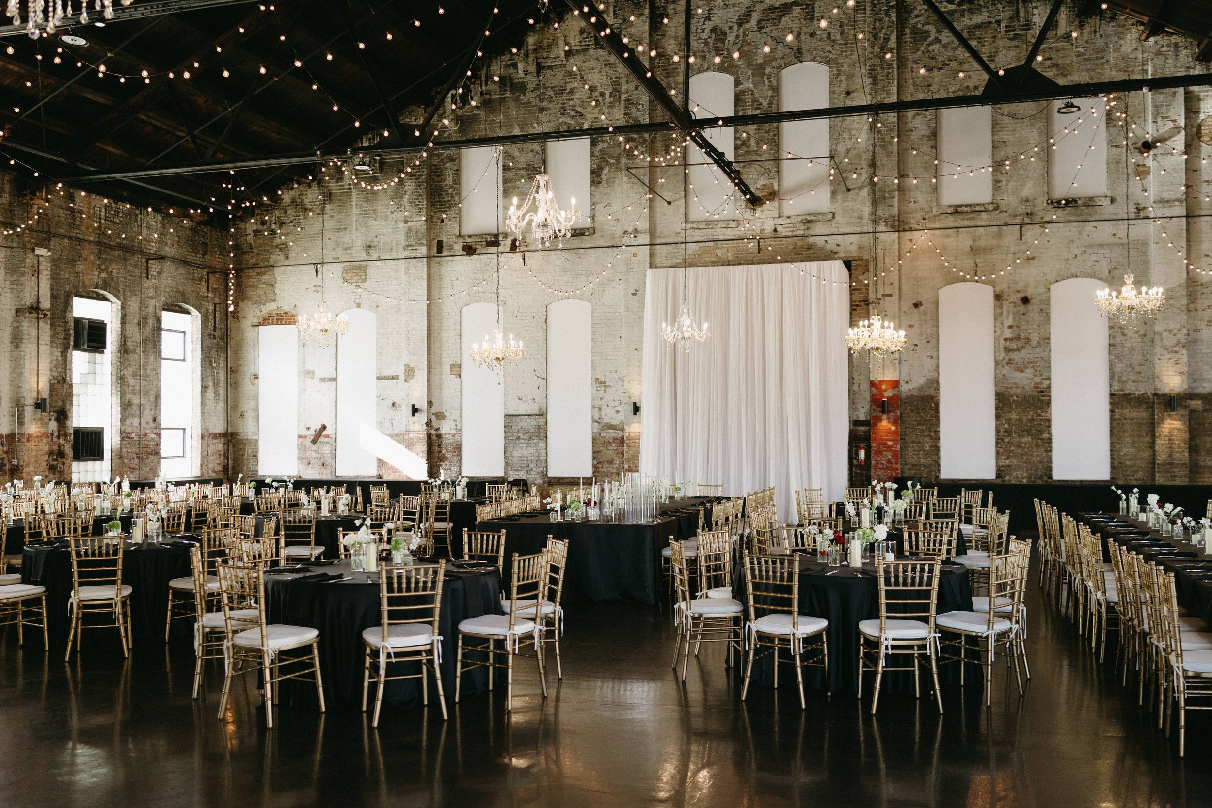 Blacksmith Main: 45 farmhouse tables, 10 plastic round banquet tables (no linens), 10 cocktail tables (no linens), and up to 300 gold chiavari chairs.